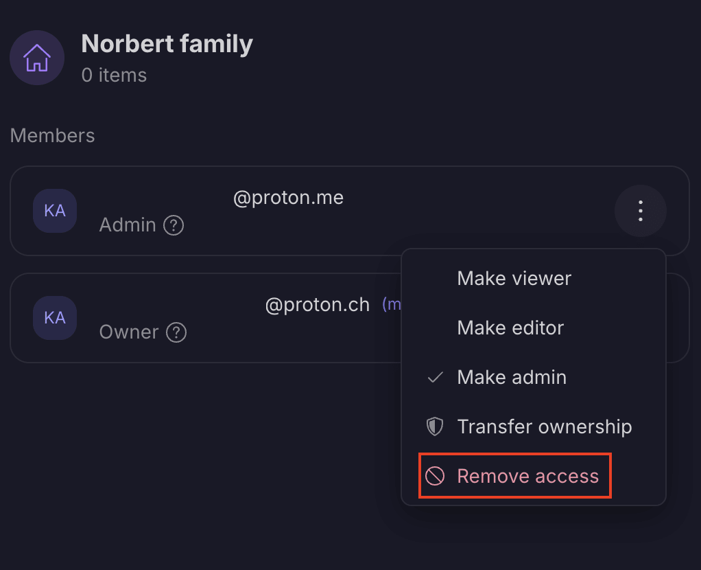 - Select the three-dot icon next to the user you’d like to remove from the vault → select Remove access.