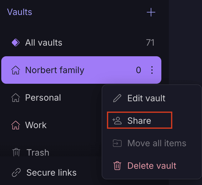 3. You can now select the three-dot icon to the left of your new vault → select Share.