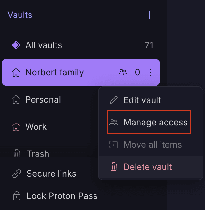 Log in to pass.proton.me(neues Fenster), then select the vault you’d like to revoke access to → select Manage access.