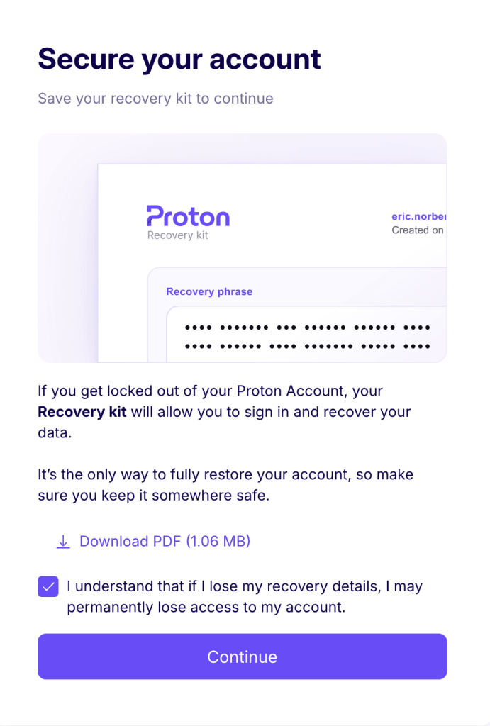 • Prepare your recovery kit by downloading the PDF containing your recovery phrase when you sign up for Proton Pass. This is the key to regaining access to your Proton account if necessary, so it must be stored securely. Store the PDF in a secure location, such as a password-protected file on your computer, or even print it out and lock it in a desk drawer.