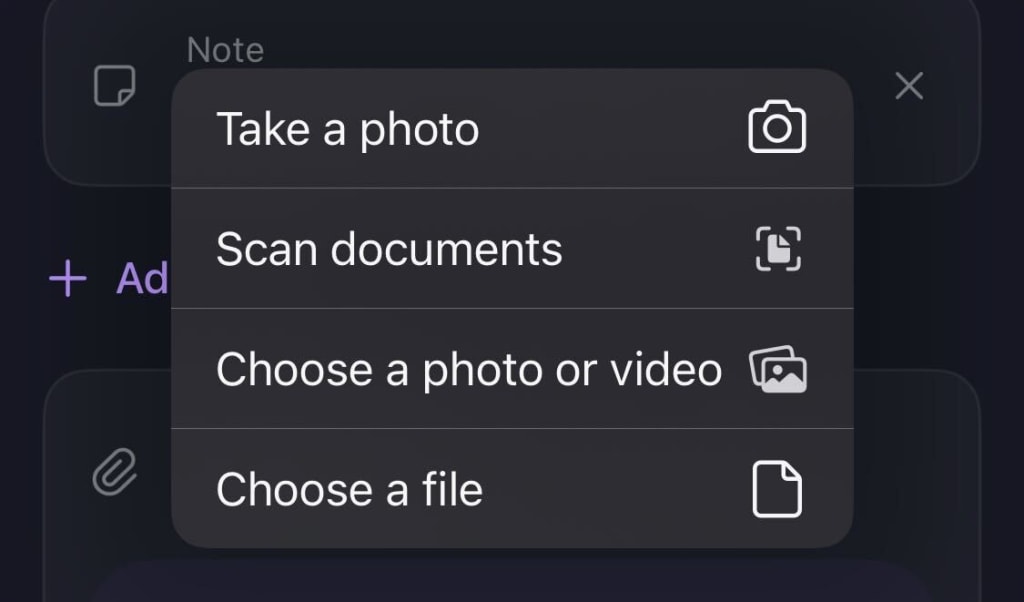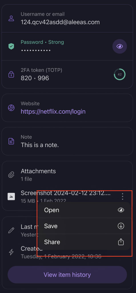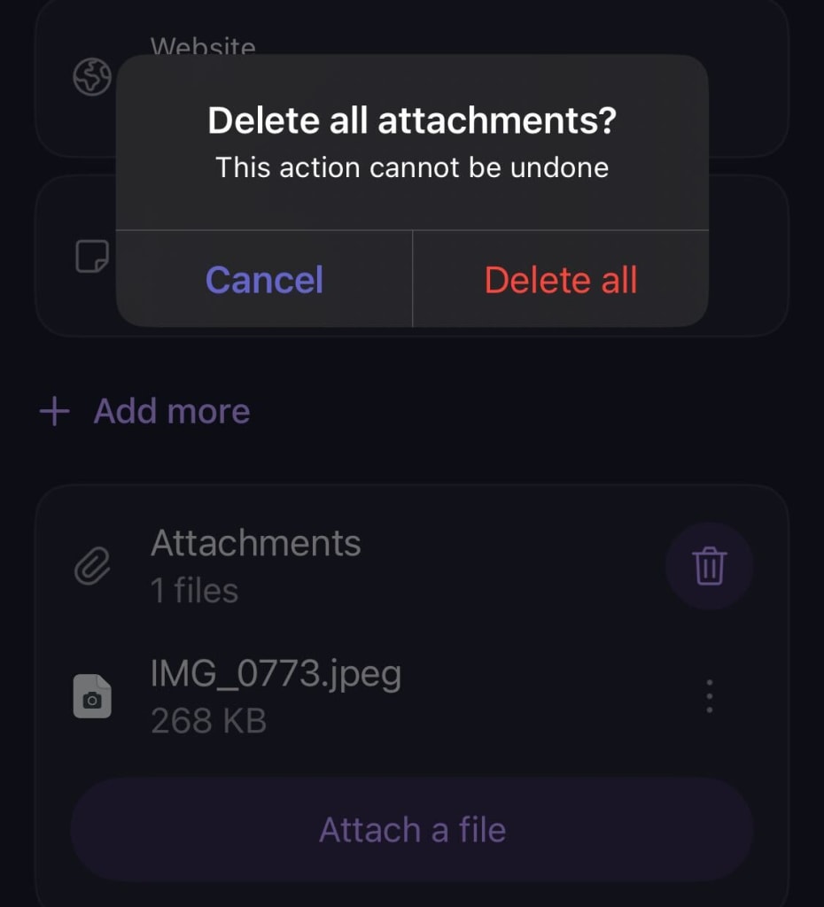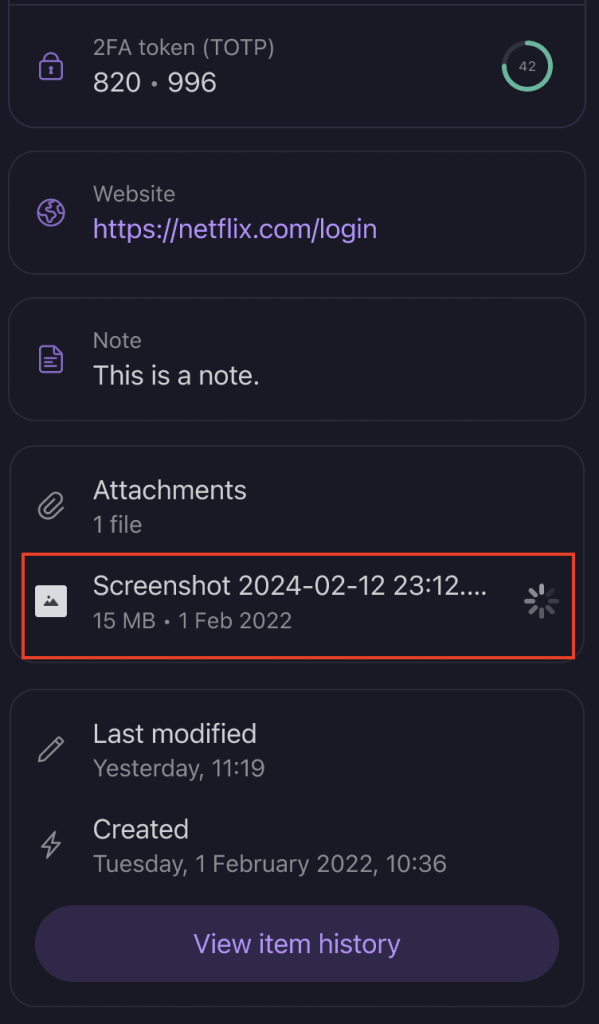 File attachments are available for all platforms, including mobile, web, desktop and browser extension. To create file attachments, you can either create a new item or edit an existing item.