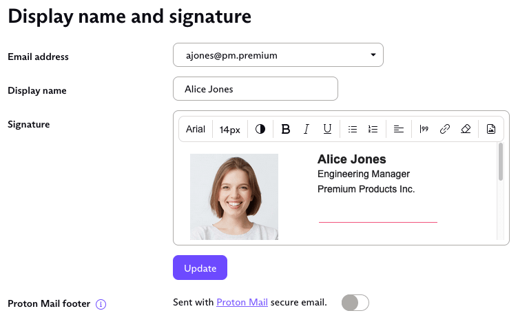 2. In the Display name and signature section, enter your display name and email signature and click Update.