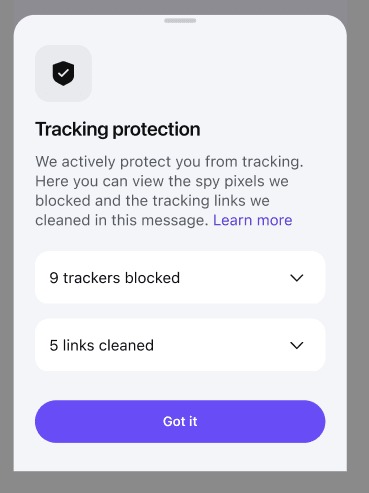 This feature is enabled by default on Proton Mail for web, iOS, iPadOS, and Android. On the web app, Proton Mail gives you added protection by removing known tracking links from links in your emails.