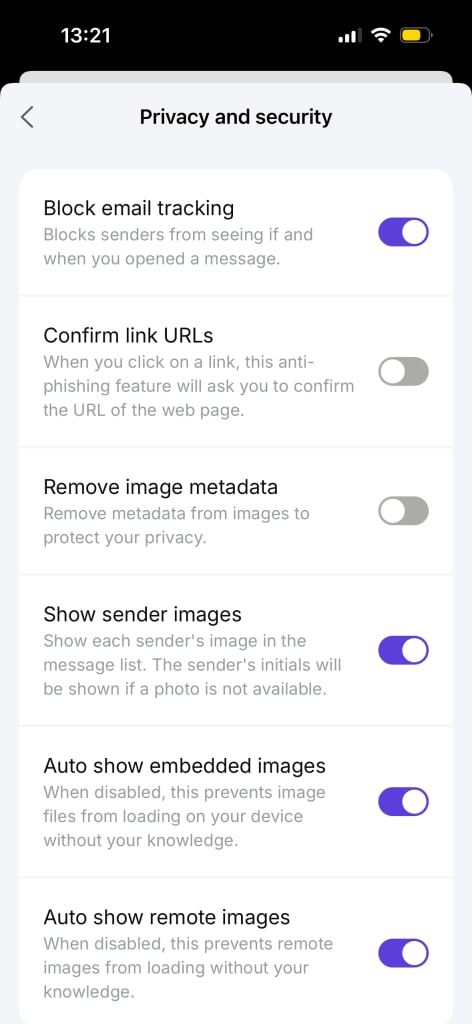 - Spy pixel protection: We remove known email trackers whenever you receive an email. We also pre-load other remote images on your behalf using a proxy with a generic IP address and geolocation. This hides your personal information and the exact time you opened the email. Images are cached for a few days for faster, secure access.