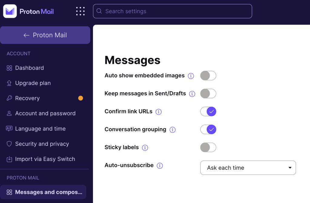 1. Sign in to Proton Mail at mail.proton.me(nueva ventana) and click Settings → All settings → Proton Mail → Messages and composing. Scroll down to the Messages section.