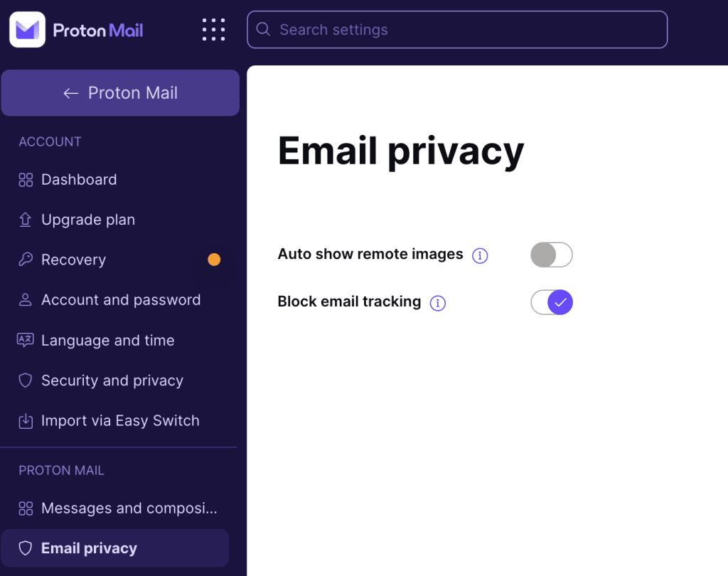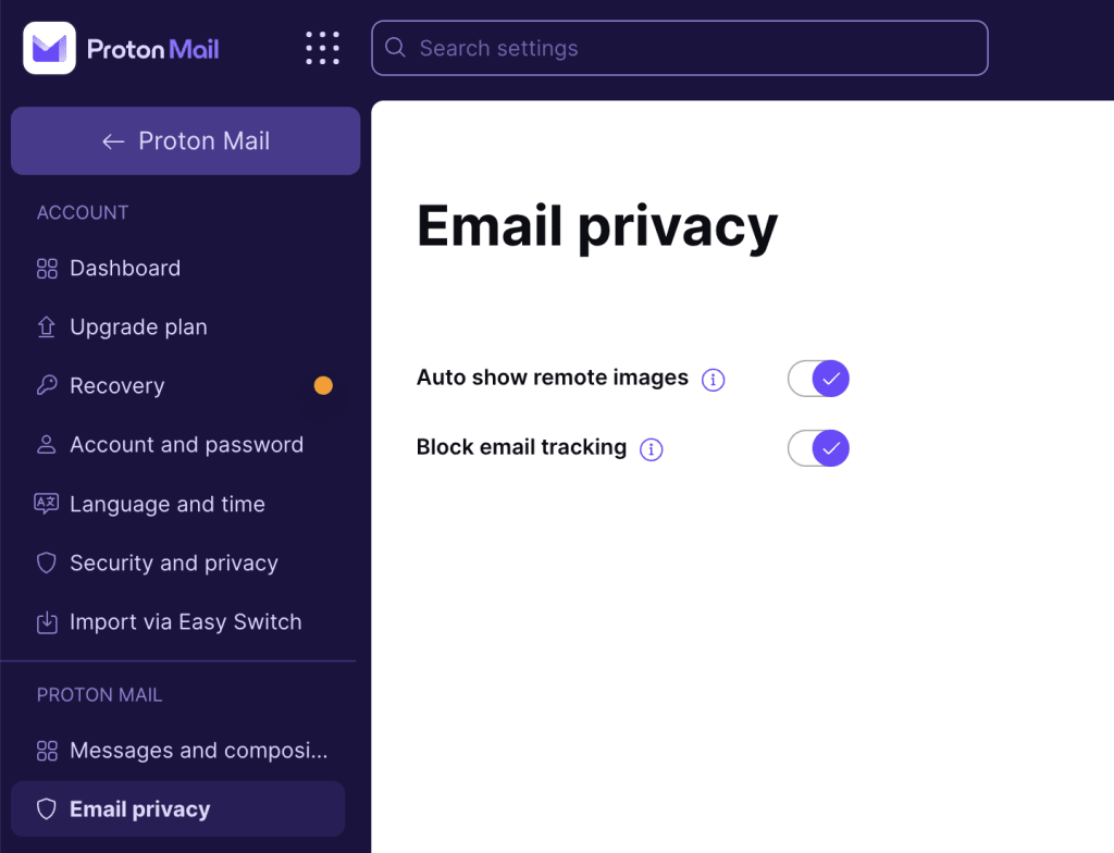 1. Sign in to Proton Mail at mail.proton.me(nueva ventana) and click Settings → All settings → Proton Mail → Email privacy.