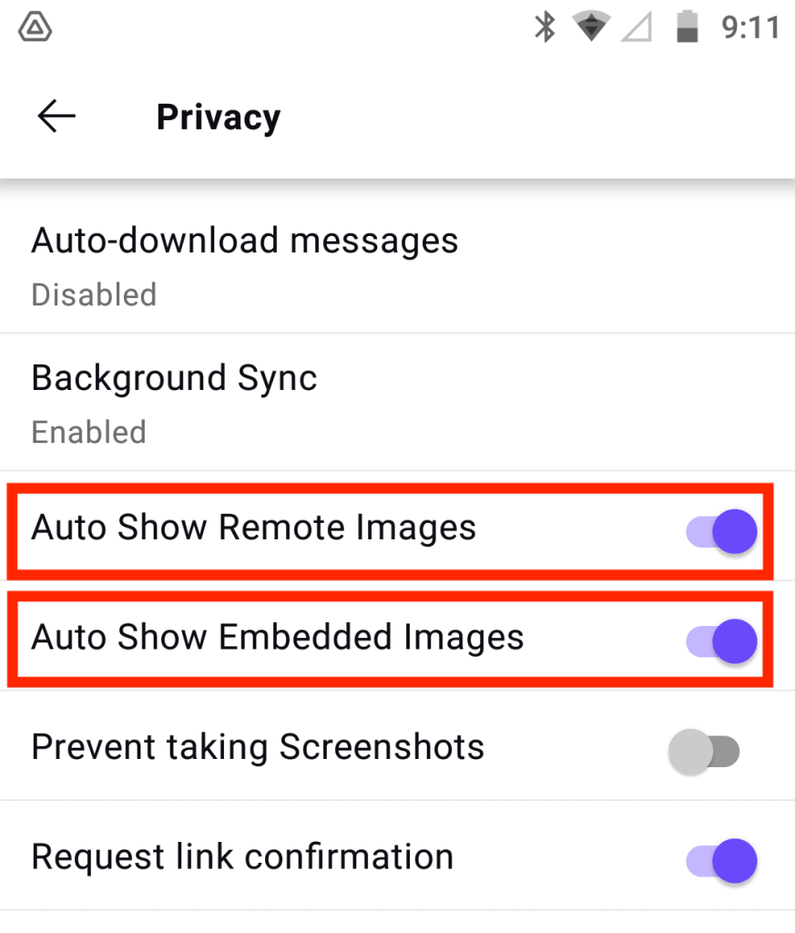 3. To set images to load automatically, turn on the Auto-load remote content and Auto-load embedded images switches.