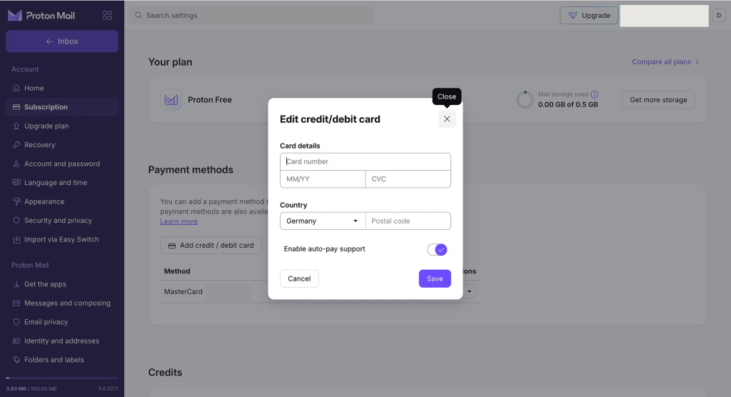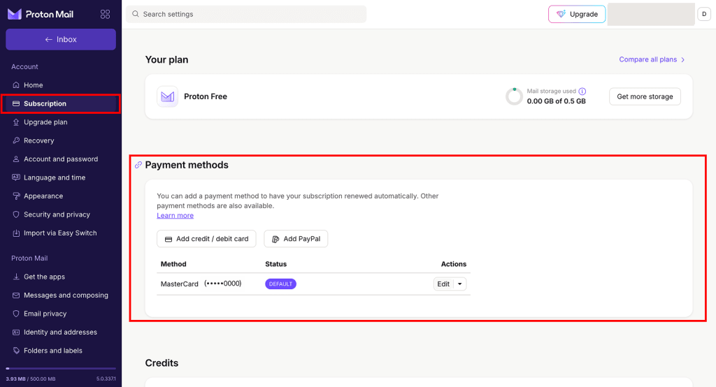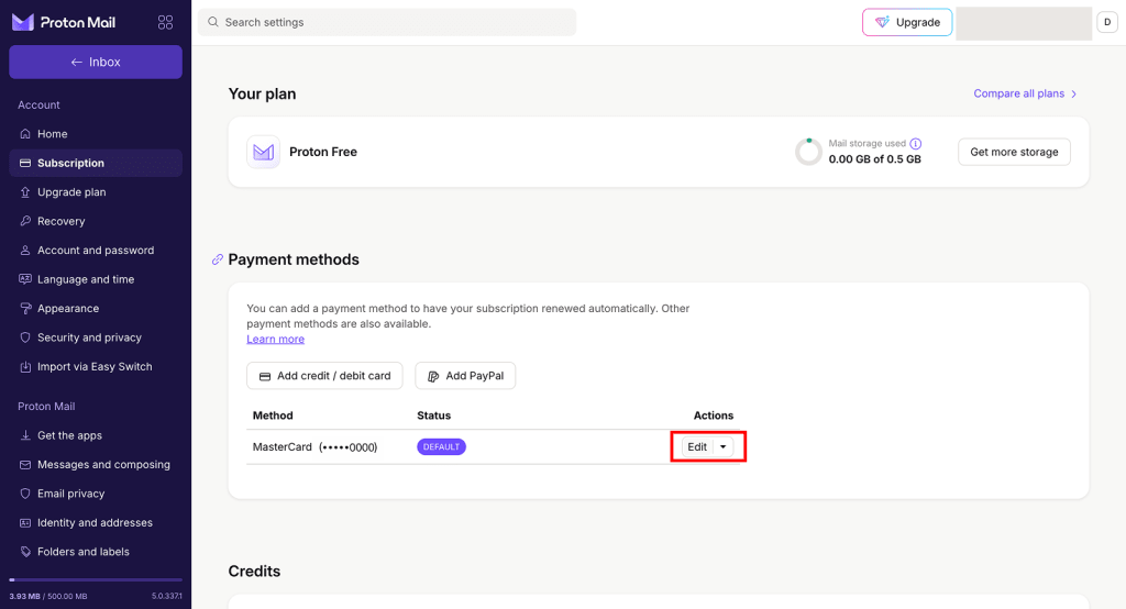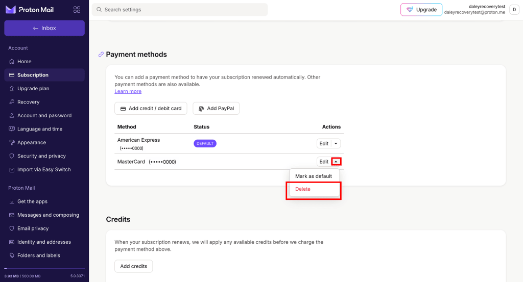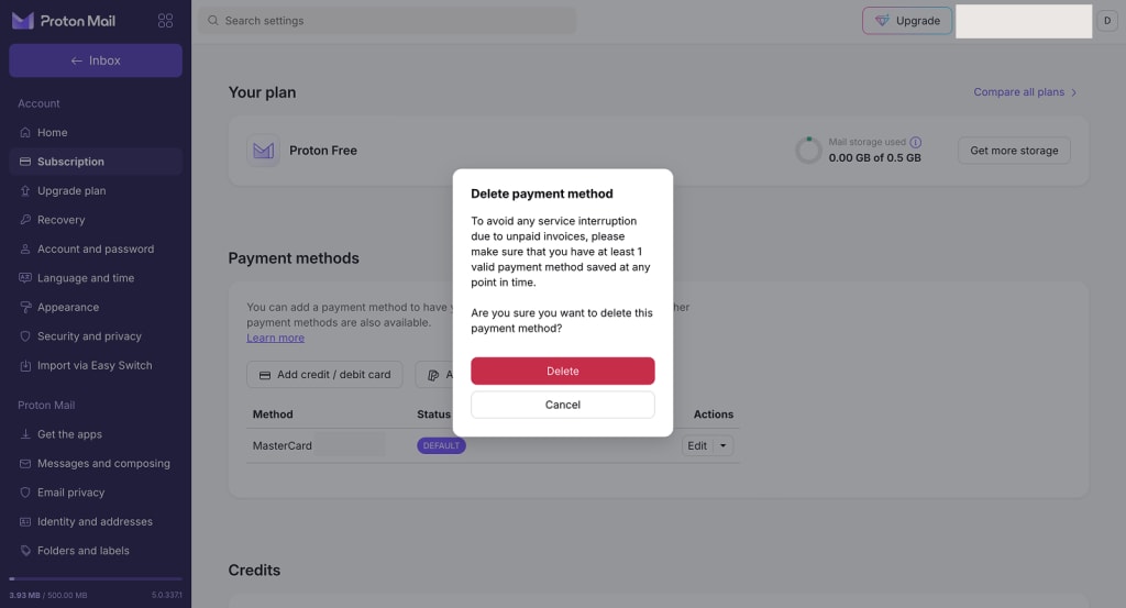 Note: Deleting your payment methods won’t automatically cancel a paid Proton subscription. To avoid unpaid invoices, cancel your subscription before removing your payment methods.