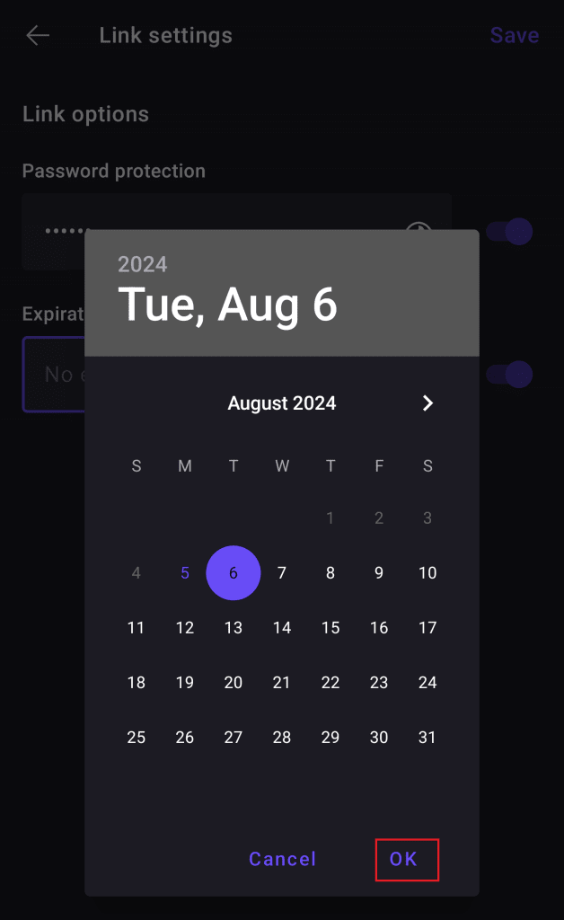 3. To set an expiration date for the link, tap inside the Expiration date field to open a calendar.