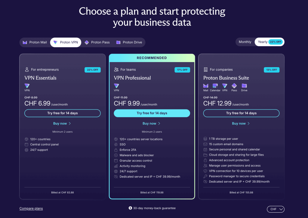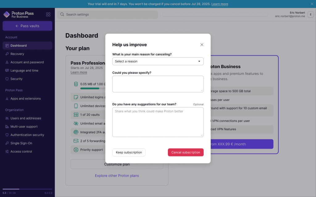If you’re not satisfied using Proton for Business, simply cancel anytime before the free trial ends to avoid being charged. Once the free trial ends and your paid subscription begins, you’re still covered for an additional 30 days under our money-back guarantee. Cancel anytime during this 30-day period and you’ll receive a prorated refund.