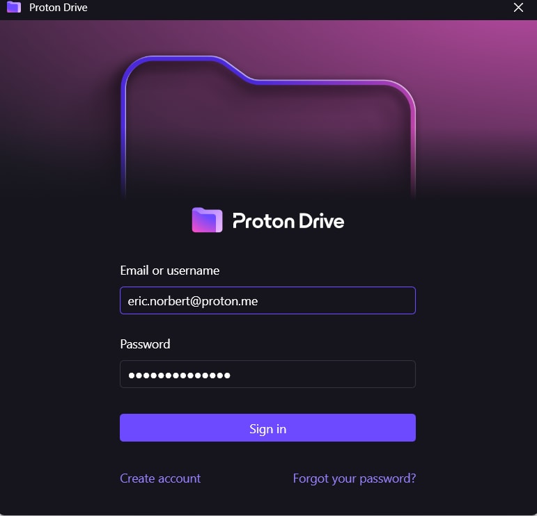 - Open the Windows app and sign into Proton Drive using your Proton Account username and password.