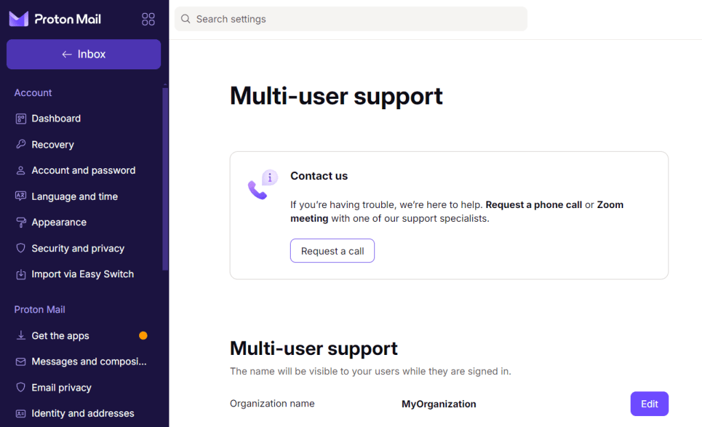 Alternatively, from the Proton Mail, Proton Calendar, Proton Drive, or Proton Pass web apps, you can go to Settings (gear icon) → All settings → Organization → Multi-user support → Contact us → Schedule a call.