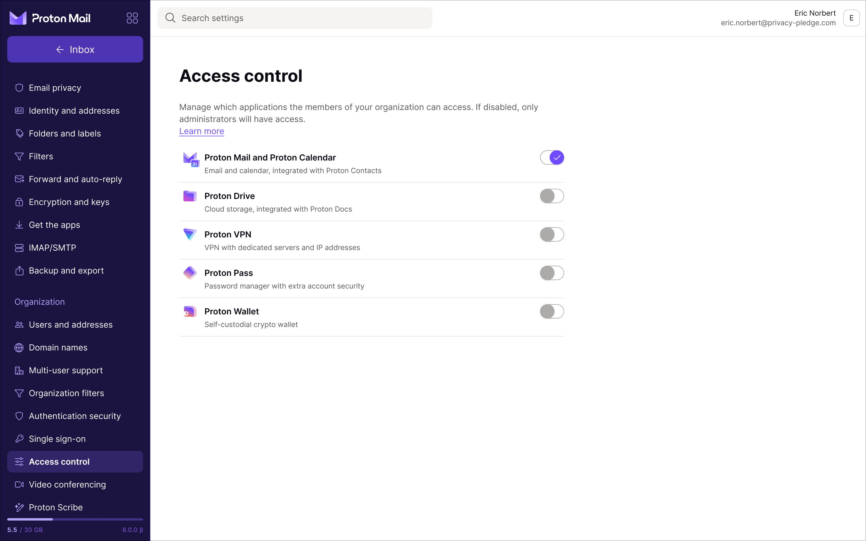Note: By default, users in your organization have access to all Proton services. However, if you turn off access to any Proton products, any new service we release will also be blocked until an admin manually turns on access.