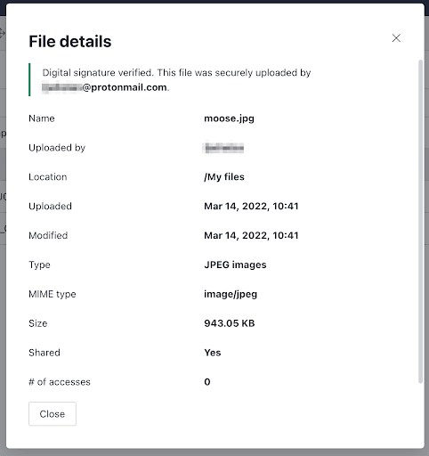 Proton validates your email address and the public key associated with your upload to ensure it is authentic. When you upload a file or folder, Proton signs it with your private key.