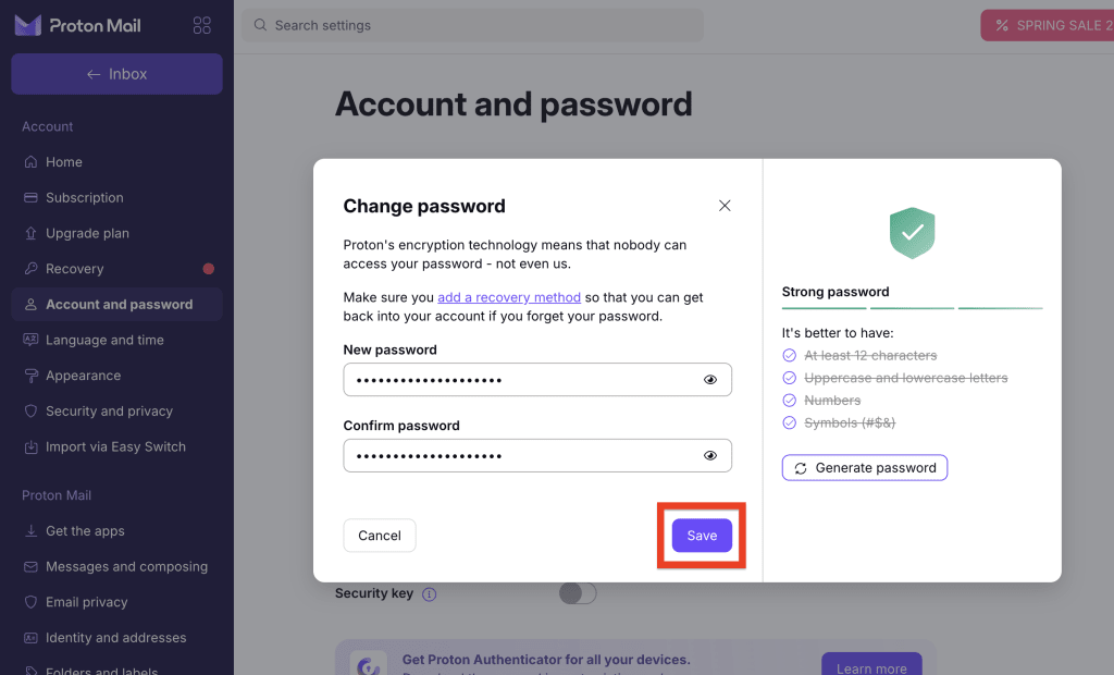 - Enter your new password in the New password and Confirm password fields. Alternatively, click Generate password to have Proton create a secure password for you.