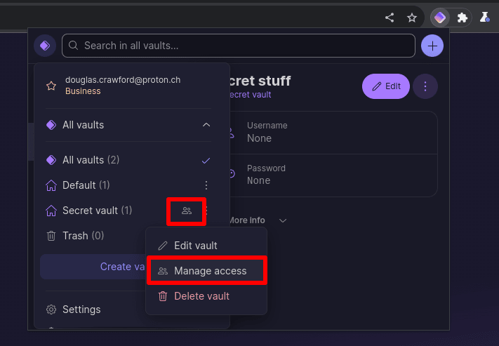 1. Open the Proton Pass app and click Vaults → All vaults → ⋮ next to the vault you’d like to manage → Manage access.