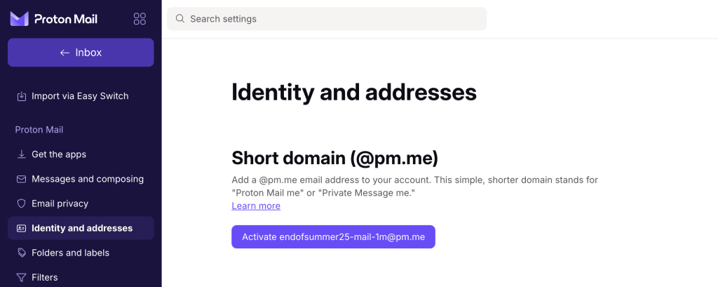 2. Go to Settings → All settings → Identity and addresses. Under Short domain, click Activate username@pm.me.
