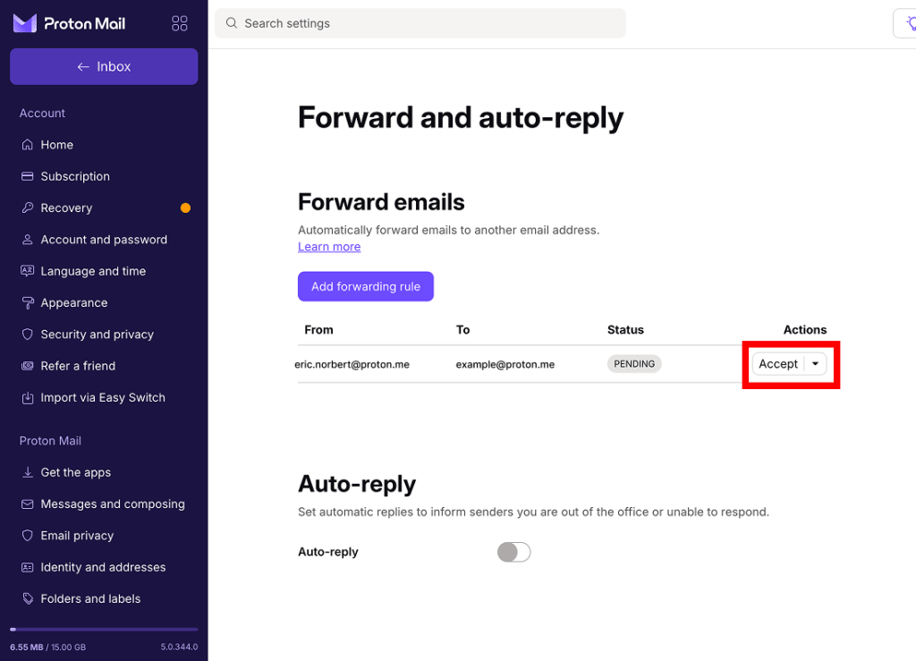 To do this for emails forwarded to your Proton Mail email address, go to Settings → All settings → Proton Mail → Auto-reply and forward → Forward emails. Next to the rule that you’d like to delete, click Actions → Delete.