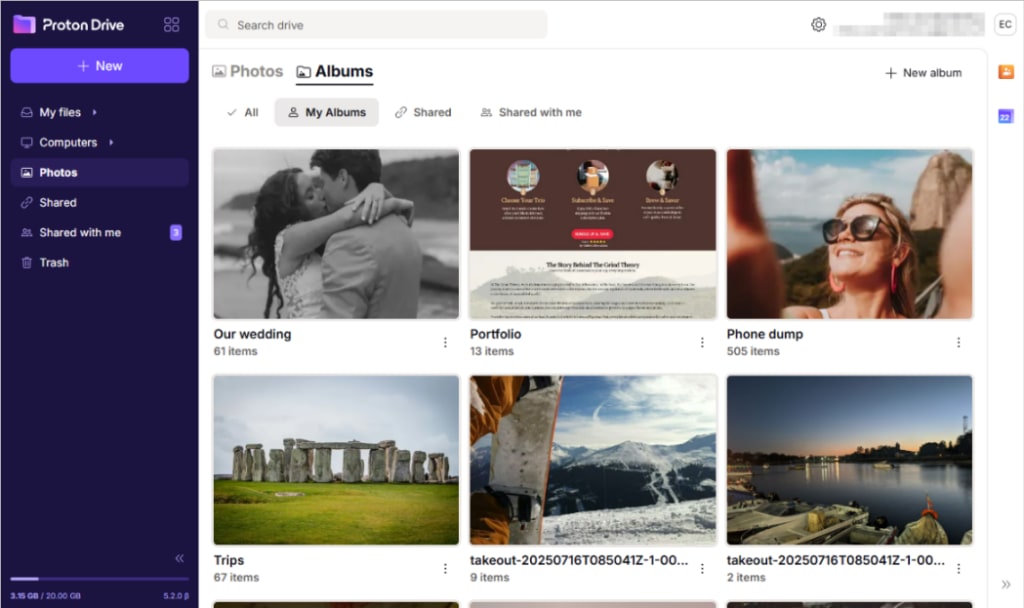 Using Proton Drive, you can easily browse your photos and videos using the timeline view, mark favorites, filter by type, and create albums if you haven’t already. You can also rename albums, set album covers, and securely share individual photos or entire albums with friends and family.