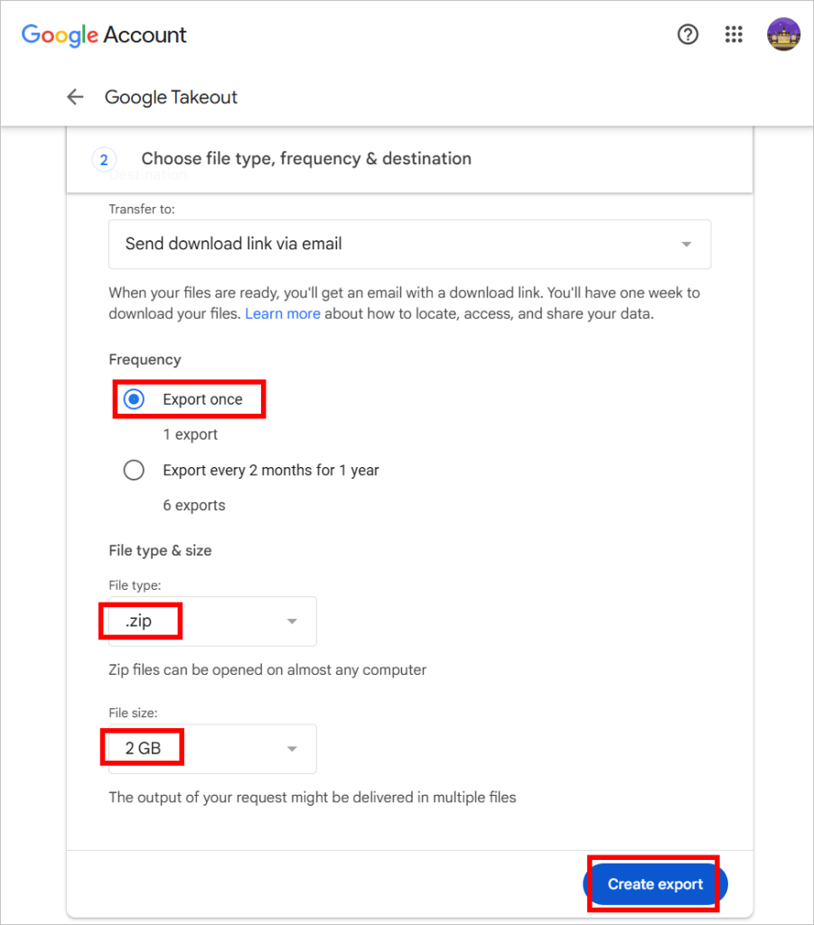 - Select Send download link via email and your preferred export settings, such as .zip file type and 2 GB file size*. Then click Create export.