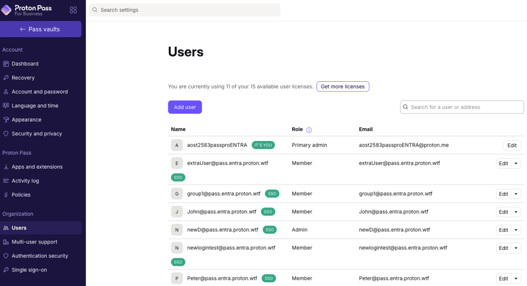 To view which users who have started using Pass, log in to your Proton Pass for Business admin panel and go to Organization → All users. (Note: SSO users will only appear here once they have signed in at least once.)