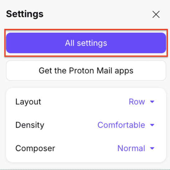 1. In the Proton Mail web app(새 창), first click the Quick Settings button (gear icon) in the top right corner of the page and then click All settings.