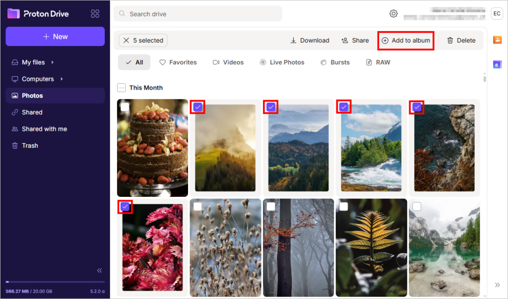 With Albums in Proton Drive, you can organize your photos and videos into visual collections that you can browse, manage, and share with others. Albums are protected with end-to-end encryption so they’re only accessible to you and those you choose to share them with.