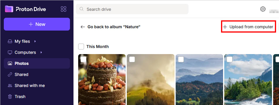 - You can also click Upload from computer to select an image and upload it to Proton Drive. It will be automatically added to that album.