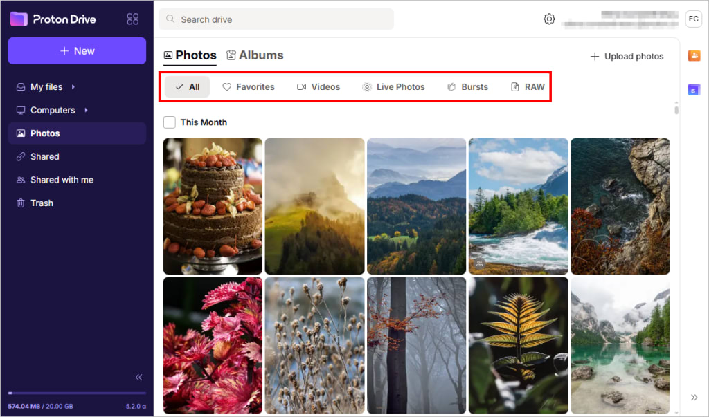 Filters in Proton Drive Photos help you quickly find specific types of pictures in your gallery — such as favorites or videos — without affecting how they are stored. Filters are applied automatically and work the same way on the web, Android, and iOS apps.