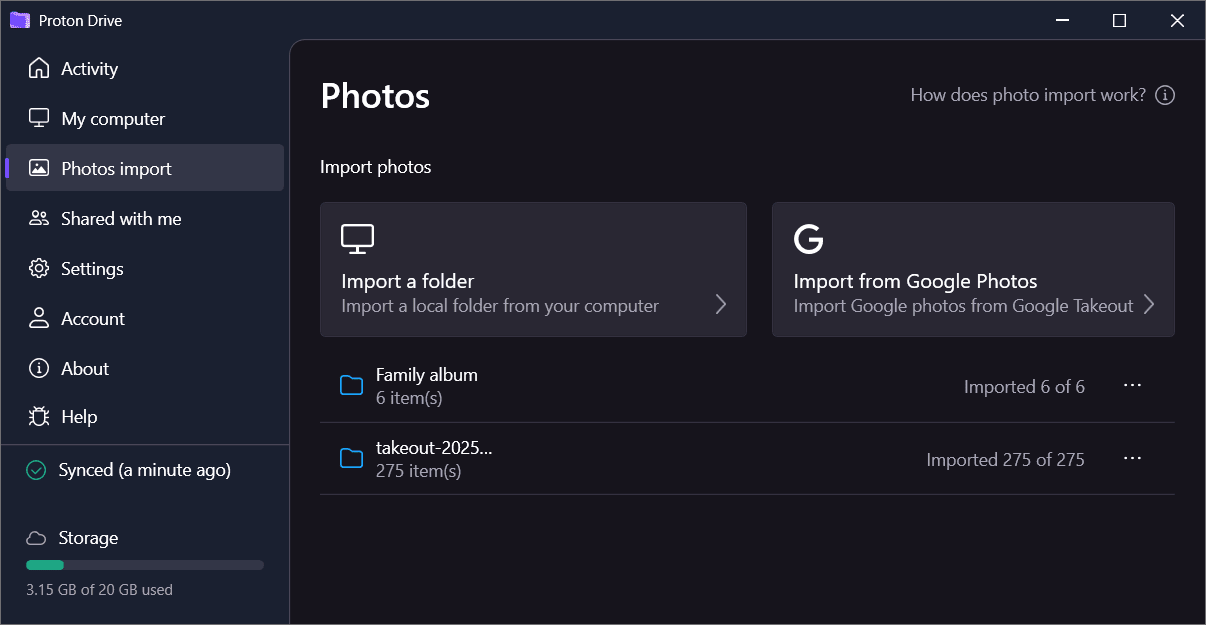 This article explains how the photo import feature works when using the Proton Drive app for Windows, whether you’re importing from Google Photos or a custom folder of photos.