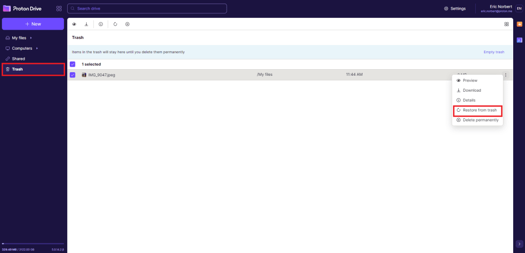 You can restore the file from either location, but if you restore it from your computer’s recycle bin, it will be treated as a new file and uploaded again. This will result in you having two copies of that file on Proton Drive: the restored version and the original still in Proton Drive’s trash. Note that items in Proton Drive’s trash count towards your storage limit.