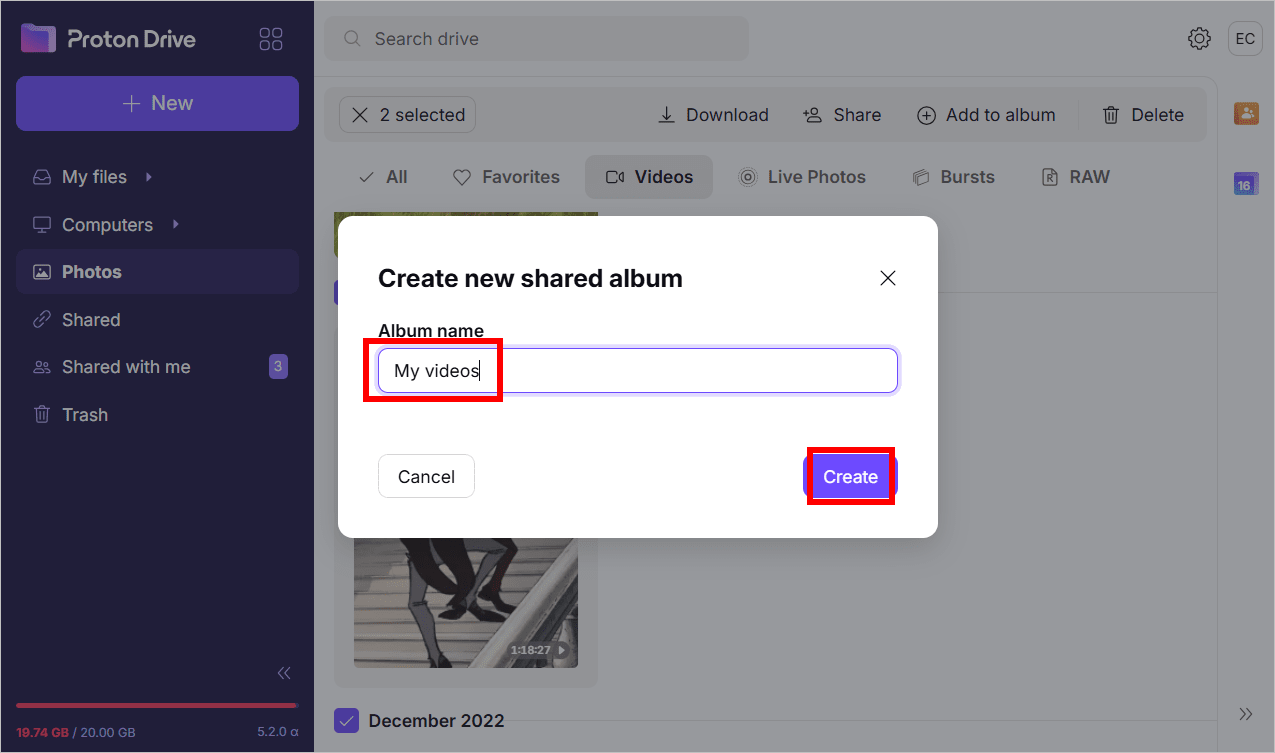 - For multiple items, select the videos, click Share, choose New shared album, enter an album name, and click Create.