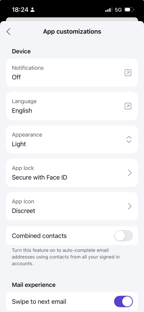 - Open the Proton Mail app. Tap Settings, then select App customizations.