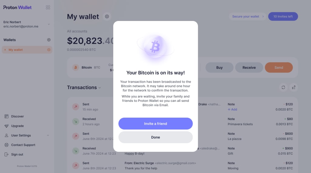 You can now receive bitcoin with this email address from other Proton Wallet users.