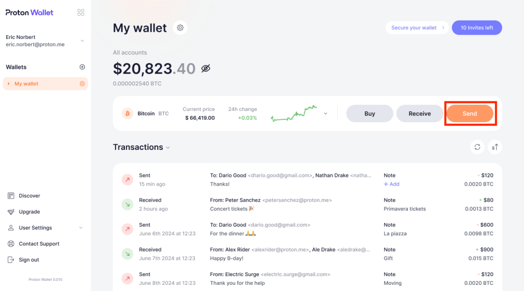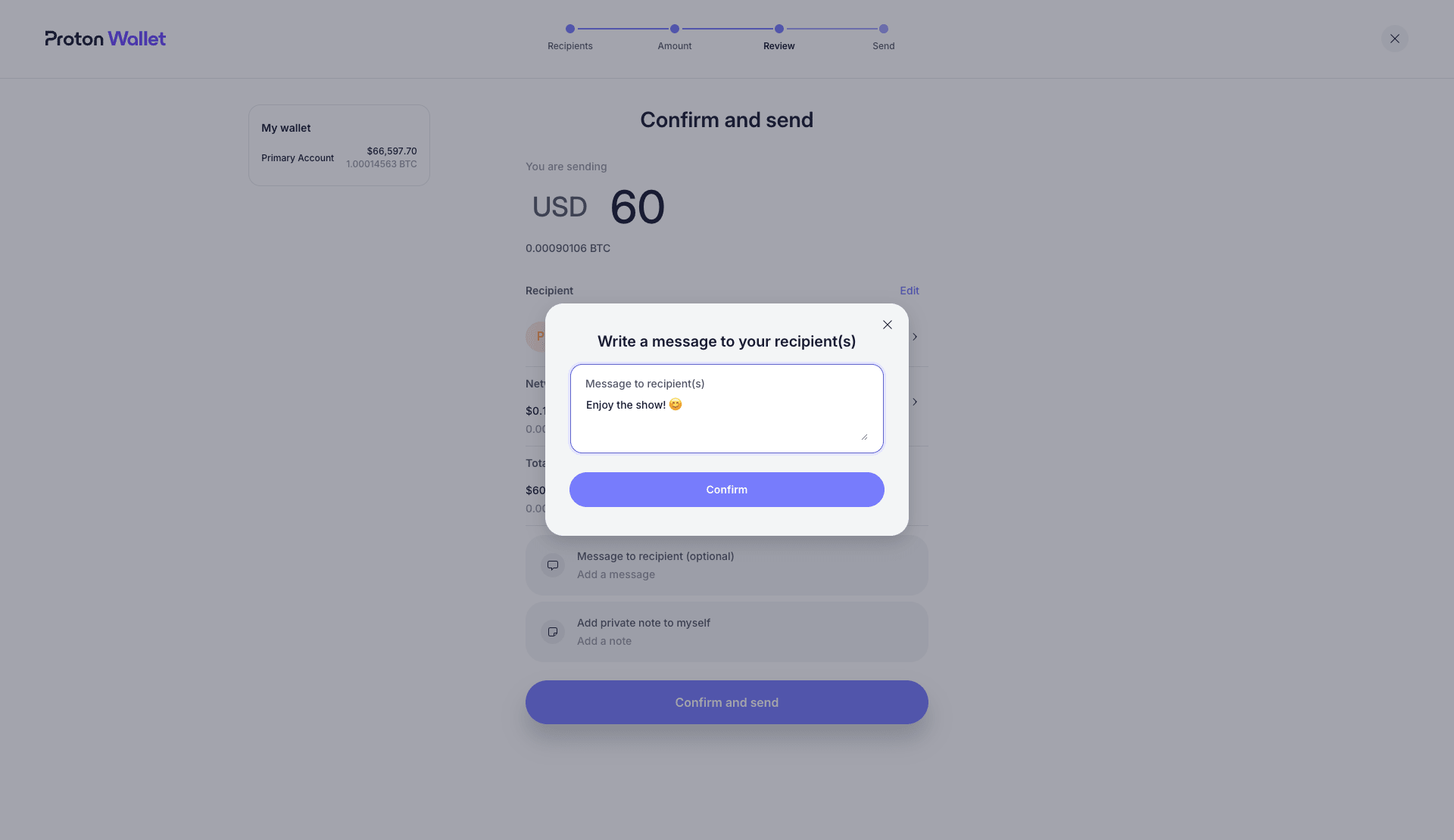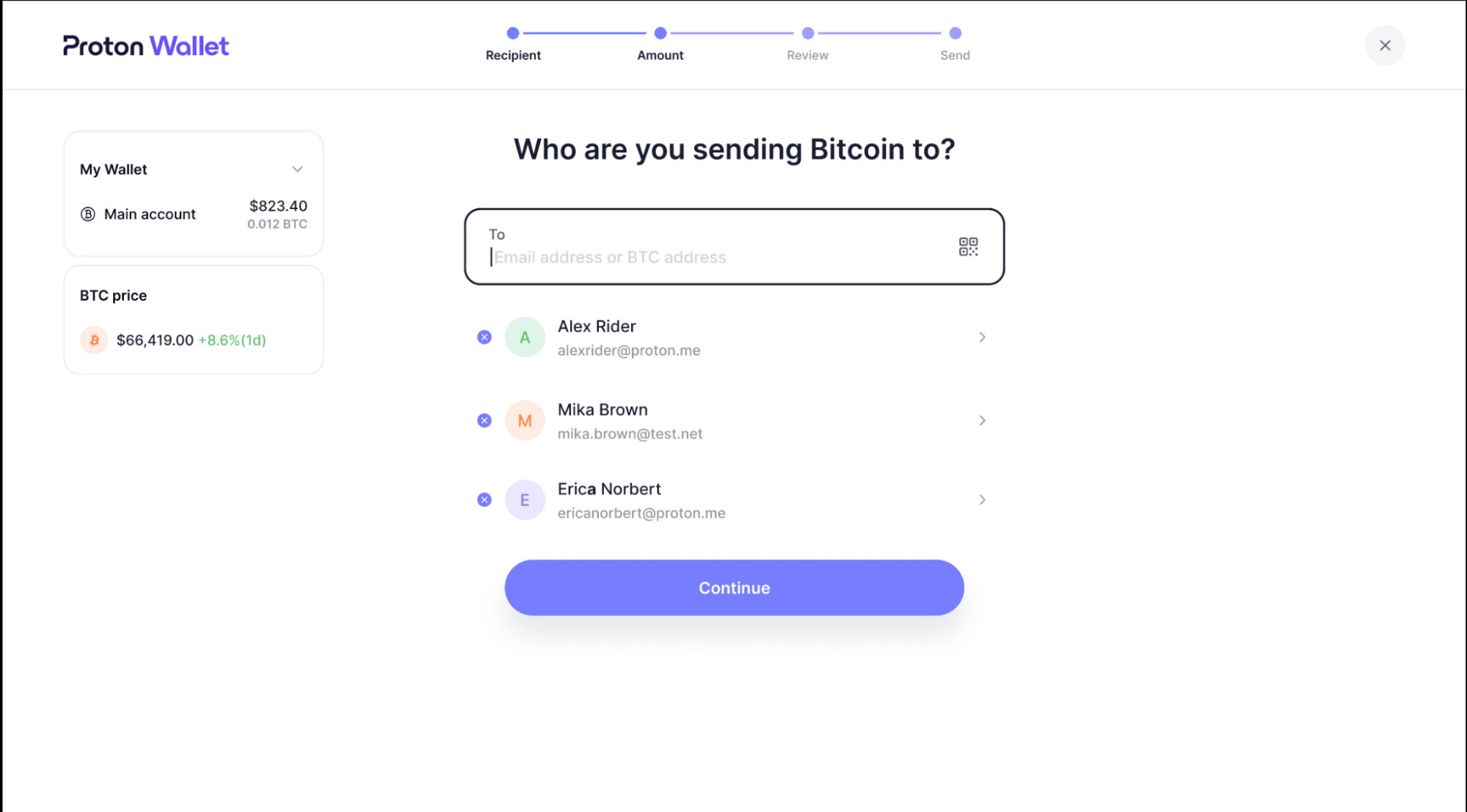 - Private messages: When sending or receiving bitcoin between Proton Wallet users with Bitcoin via Email, you can exchange end-to-end encrypted messages directly alongside your transaction, and see familiar email addresses displayed as “From email” or “To email” instead of complex Bitcoin addresses.