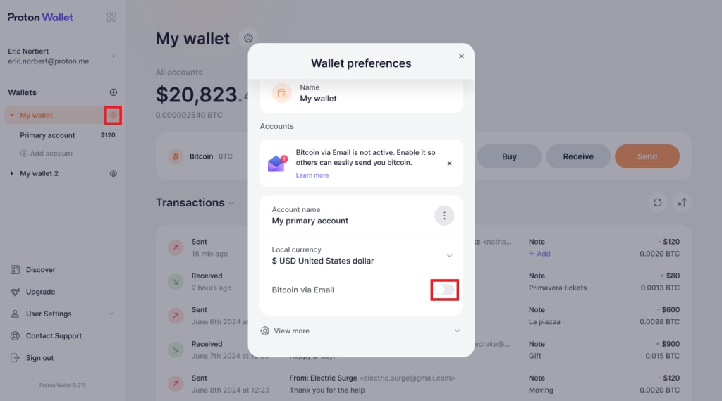 Bitcoin via Email is automatically enabled along with your first wallet when you create your Proton Wallet account. If you create additional wallets, you’ll need to enable Bitcoin via Email for each one to take advantage of this time-saving feature.