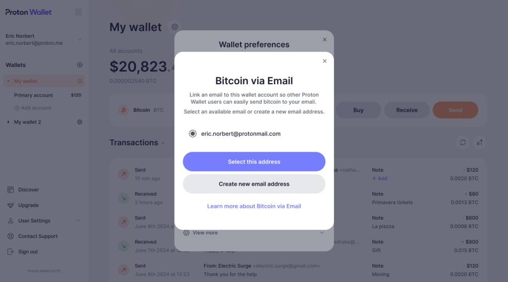 A pop-up window will appear. You can click or tap the email address you would like to use to send and receive Bitcoin. If you want to create a new Proton Mail email address for Bitcoin via Email, this is possible from the web application.