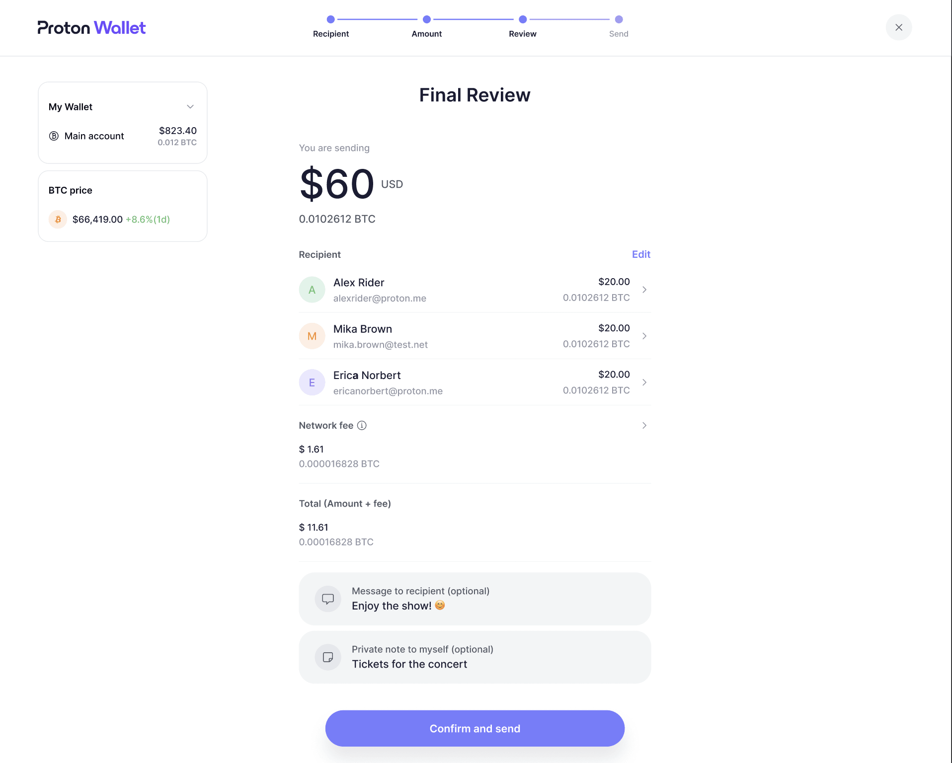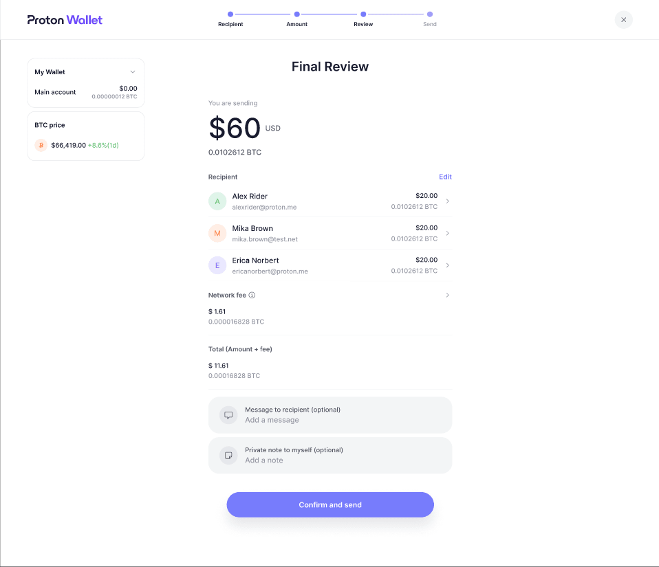Once you have reviewed everything, send the transaction by clicking or tapping Confirm and Send. This will broadcast the transaction to the Bitcoin network, and there is no way to undo or cancel it. Proton Wallet will also send notification emails to you and any recipient using Bitcoin via Email.