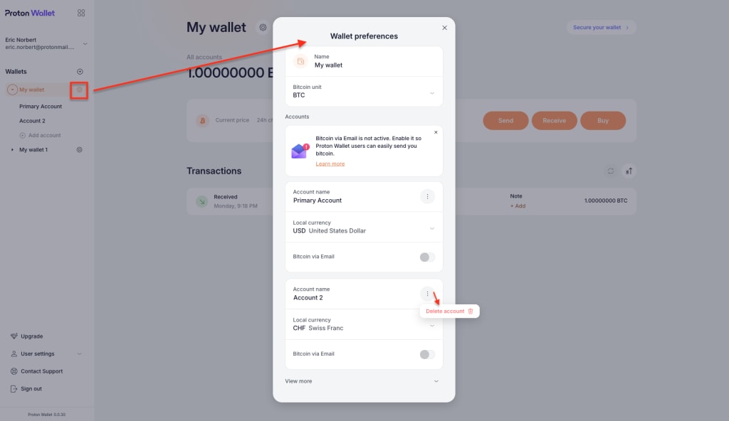 3. In the main window, click or tap (settings button) next to the wallet name. In the resulting pop-up, scroll down to the Bitcoin account you want to delete, click or tap the three dots next to its name, then click or tap Delete account.