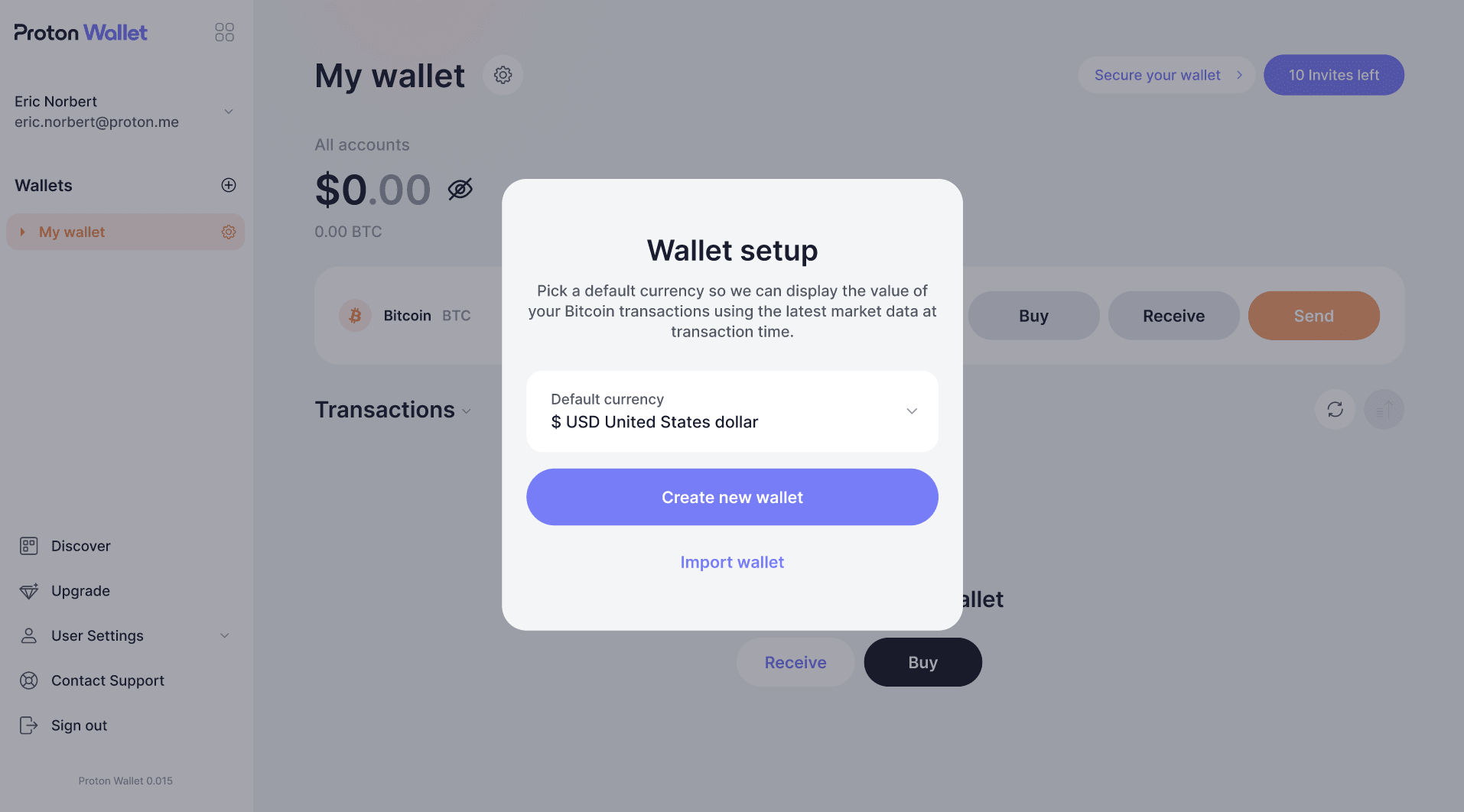 Proton Wallet makes creating your first wallet as easy as possible. All you need to input is the default currency that you would like to see your bitcoin transactions in.