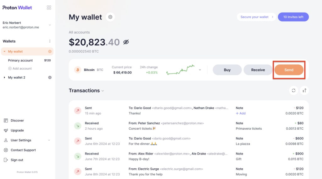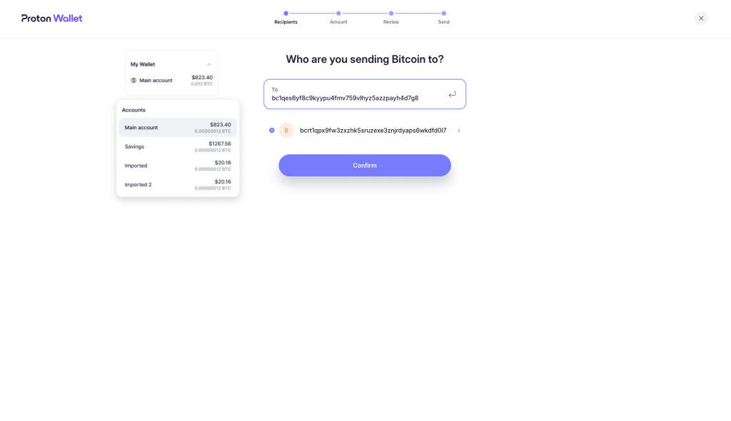 By default, Proton Wallet uses your primary account to send BTC to your recipient(s). You can select another account in the left menu.