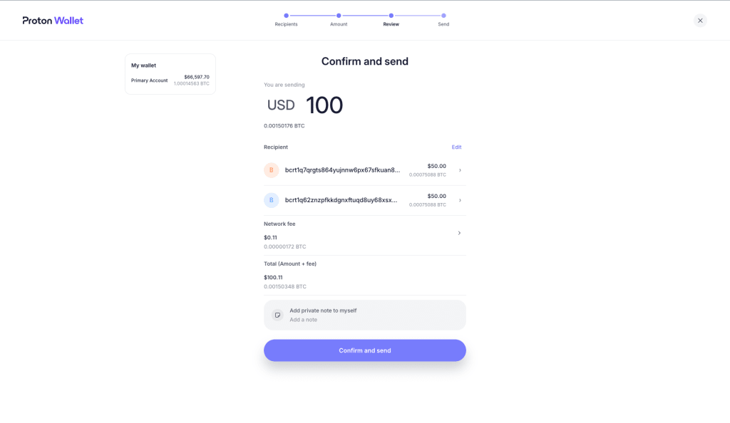 Once you’ve reviewed the BTC address of your recipient(s) and added any notes, confirm the transaction by selecting Confirm and send to initiate the BTC transfer.