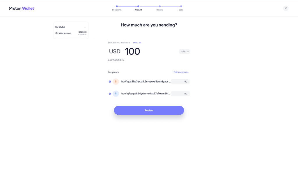 Once you’ve chosen your recipient(s), you can enter how much BTC you’d like to send. This is displayed in your preferred currency for easy visualization.