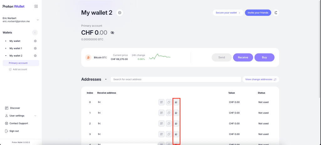 This should be the address where you intend to receive BTC, and ideally, you should not have used it previously. Once you’ve selected the address, click the message signing icon next to it.