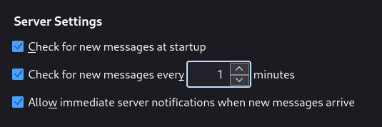 Open the Menu from the top-right → choose Account Settings → select your account on the left side and choose Server Settings under it. Then make sure “Check for new messages every X minutes” is selected, and set the time to 1 minute.