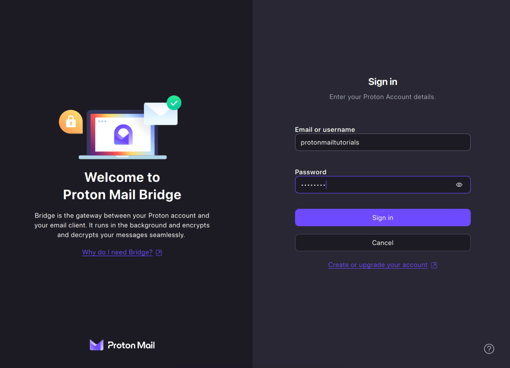 1. Install Proton Mail Bridge, open the app, enter your Proton Mail account details, and click Sign in.