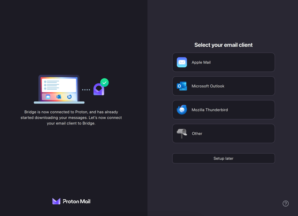 2. Your account is now successfully connected to Proton Mail Bridge. Use one of the buttons to choose your email client so our setup wizard can better help you configure your account.