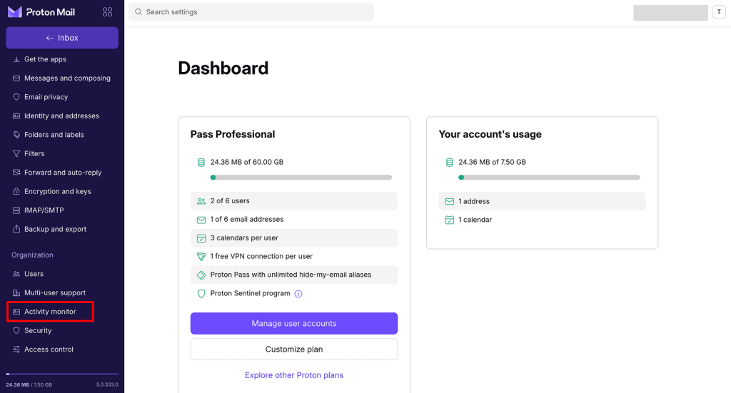Account monitor is one of Proton for Business’ activity monitoring(nova janela) tools. You can see all monitoring tools available for your account in the activity monitor dashboard.