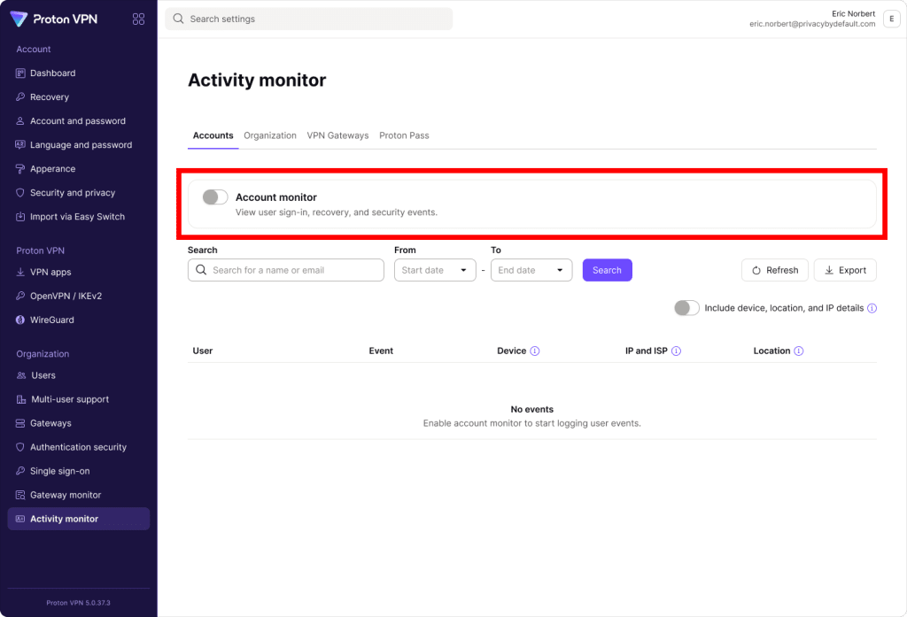 Account monitor shows activity related to authentication and account management. This helps Proton for Business organizations spot unusual behavior and potential security issues.
