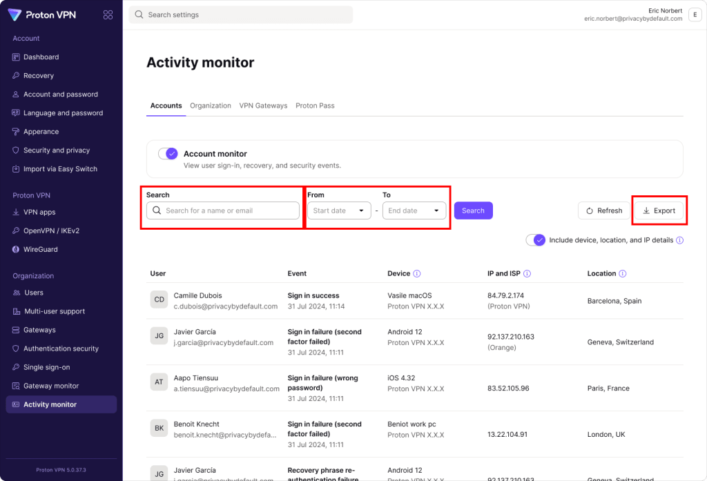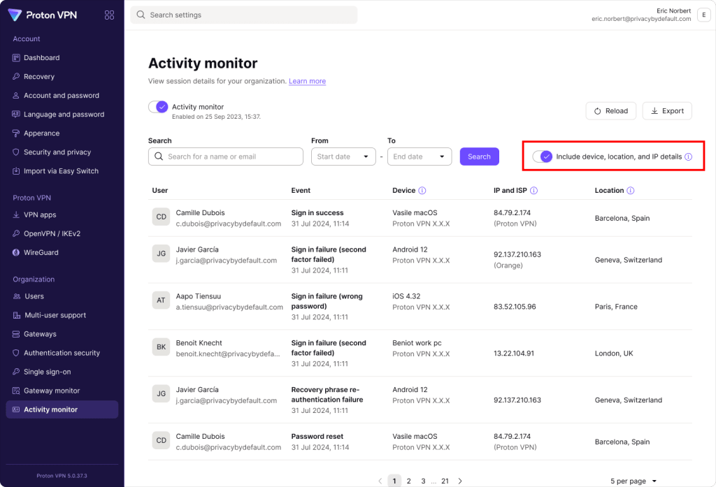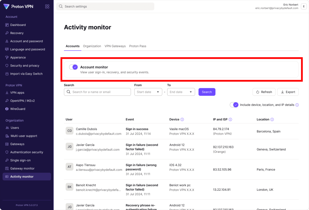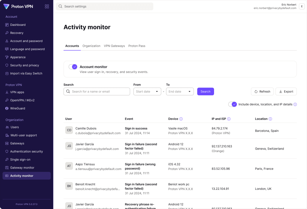 Account monitor gives IT and security teams visibility into how Proton for Business accounts are being accessed. This allows organizations to: